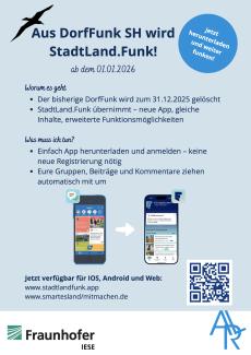 Entwicklung ist oftmals etwas Gutes, so auch eine Neuerung im Bereich "Dorfkommunikation". Ab dem 01.01.2026 wird die DorfFunk App zur "StadtLand.Funk" App. Der Name ist anders, die App weiterentwickelt und moderner, der Treffpunkt der selbige! Man muss keine neue Registrierung vornehmen oder sonstiges - nur eine neue App herunterladen und weitermachen!